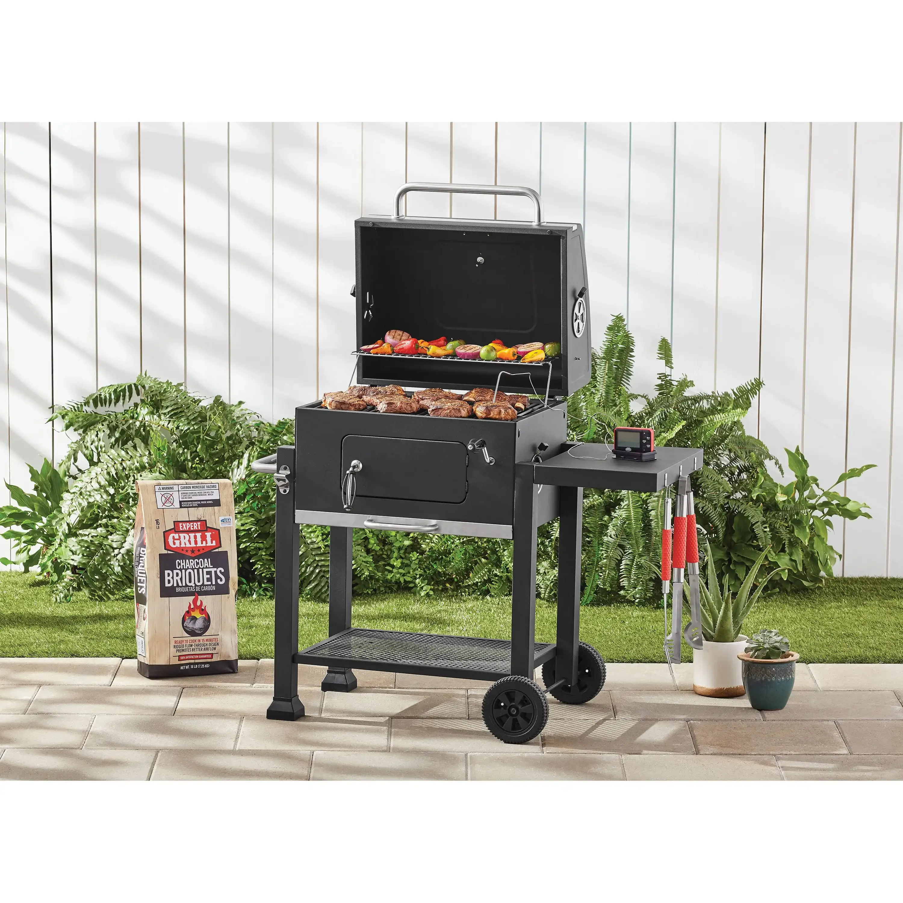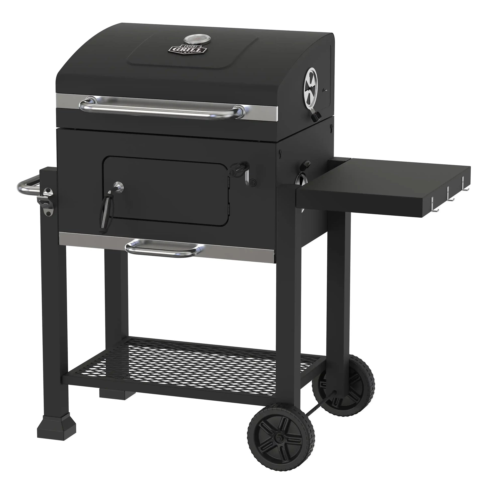 With plenty of grill space to cook for all your family and friends, the Heavy Duty 24" Charcoal Grill will be the star at your next backyard barbecue or gathering. This cart-style grill has a 372 sq. in. main cooking surface that's large enough to grill 20 burgers at once plus a 201 sq. in. warming rack. This grill is equipped with heavy-duty cast iron cooking grates that retain heat exceptionally well and produce restaurant-quality sear marks on steaks, burgers, chicken, and more. Other features include a charcoal access door, an adjustable charcoal pan, and built-in, easy-to-read lid thermometer. The foldable side shelf offers space for platters, marinades, and more, and the shelf has three hooks to keep grill tools and utensils within easy reach. Wheels on the right legs offer easy maneuverability around a porch, patio, or deck. The Heavy Duty 24" Charcoal Grill is available in black with a durable, powder-coated finish.