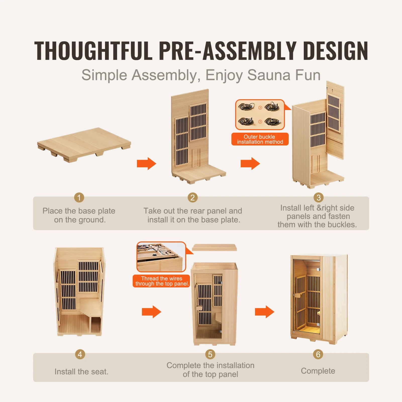 Pre-Assembled Design: The sauna room features a pre-assembled design, requiring only simple assembly upon receipt. Clear installation instructions and wiring diagrams are provided, eliminating the hassle of complicated screw fittings.